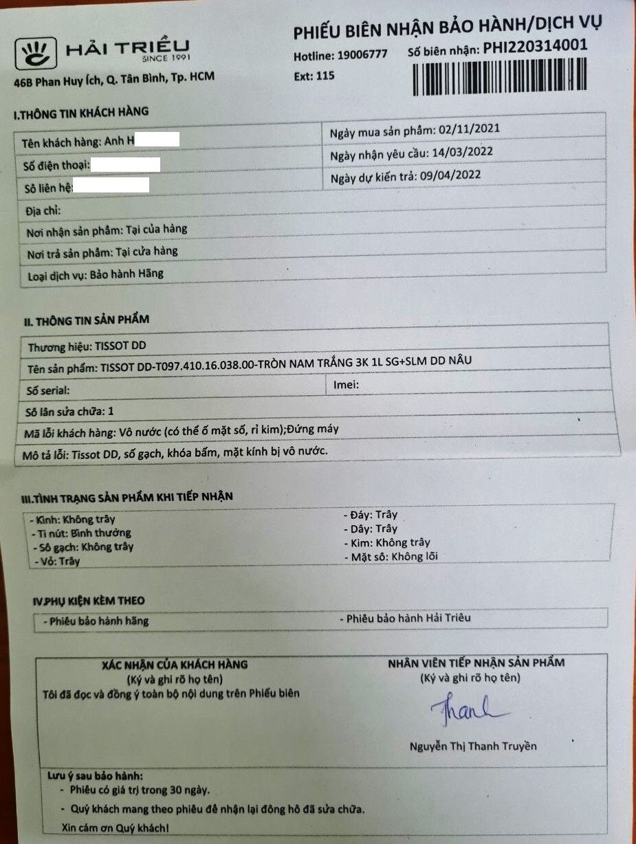 Sau sự cố trên, ngày 14/3/2022, anh H đã đến cửa hàng nơi mình mua để bảo hành. Mãi đến ngày 9/4, anh mới nhận lại được đồng hồ mình. Theo thông tin từ phiếu thu kiêm phiếu bảo hành dịch vụ thì đồng hồ của anh H được hãng lau dầu, thay bộ ron, thay cốt ty, thay pin.