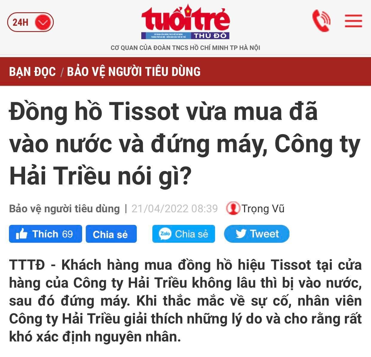 Thông tin trên Tuổi trẻ Thủ đô, anh Đ.H (ngụ quận Phú Nhuận, TP HCM) phản ánh về việc mua đồng hồ Tissot tại cửa hàng Hải Triều thuộc Công ty TNHH Đồng hồ Hải Triều (Công ty Hải Triều) có dấu hiệu kém chất lượng.