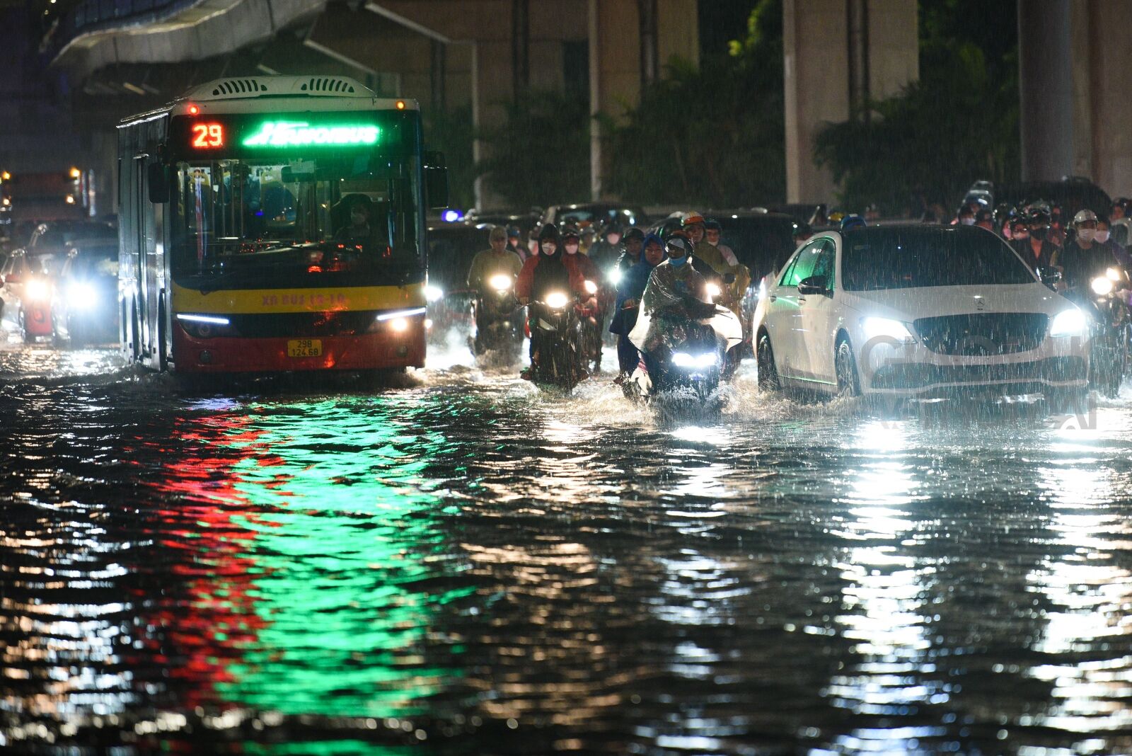 Trận mưa lớn trút xuống vào tối ngày 13/6 khiến nhiều tuyến phố bị ngập sâu, các phương tiện di chuyển khó khăn.