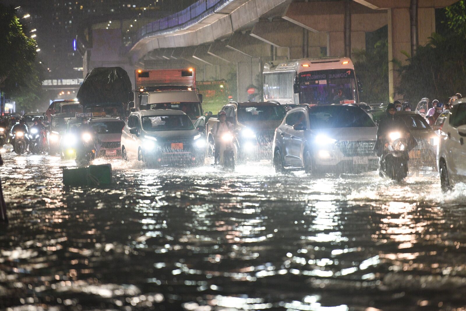 Nhiều tuyến đường rơi vào tình trạng ngập nước, các phương tiện di chuyển khó khăn.