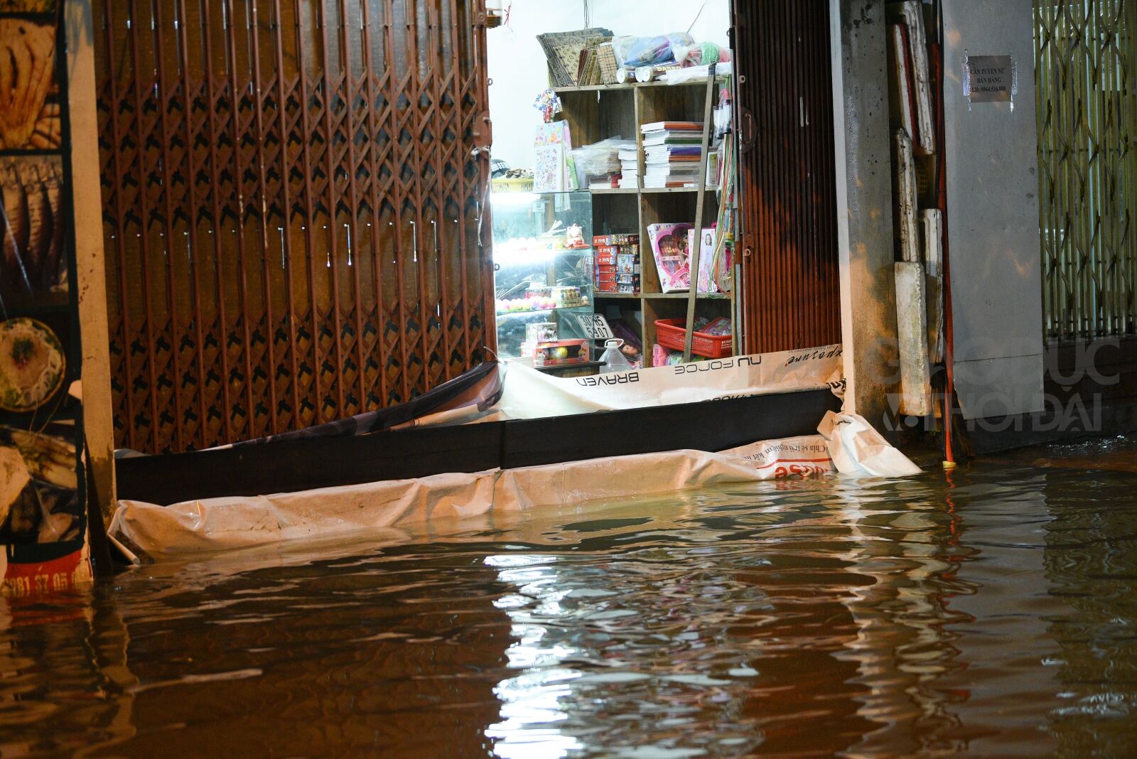 Nhiều nhà phải dùng bạt, ván gỗ để chắn trước cửa nhà ngăn sóng nước tràn vào trong.