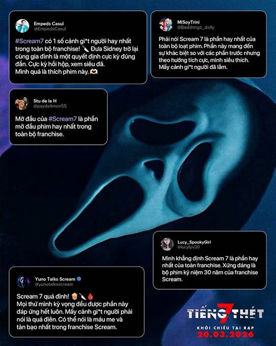Trên Rotten Tomatoes, Tiếng Thét 7 đạt điểm “tươi” 77% từ khán giả, cho thấy mức độ yêu thích chưa từng “hạ nhiệt” của công chúng dành cho chuỗi phim dài hơi này. Đặc biệt, năm 2026 đánh dấu lần đầu tiên sau 30 năm, phim được chiếu tại rạp Việt Nam, mang hành trình của Ghostface ra mắt khán giả. Với nhiều lời khen ngợi và đánh giá cao, dự án hứa hẹn sẽ có hành trình chinh phục doanh thu “không phải dạng vừa” trong tháng 3 này.
